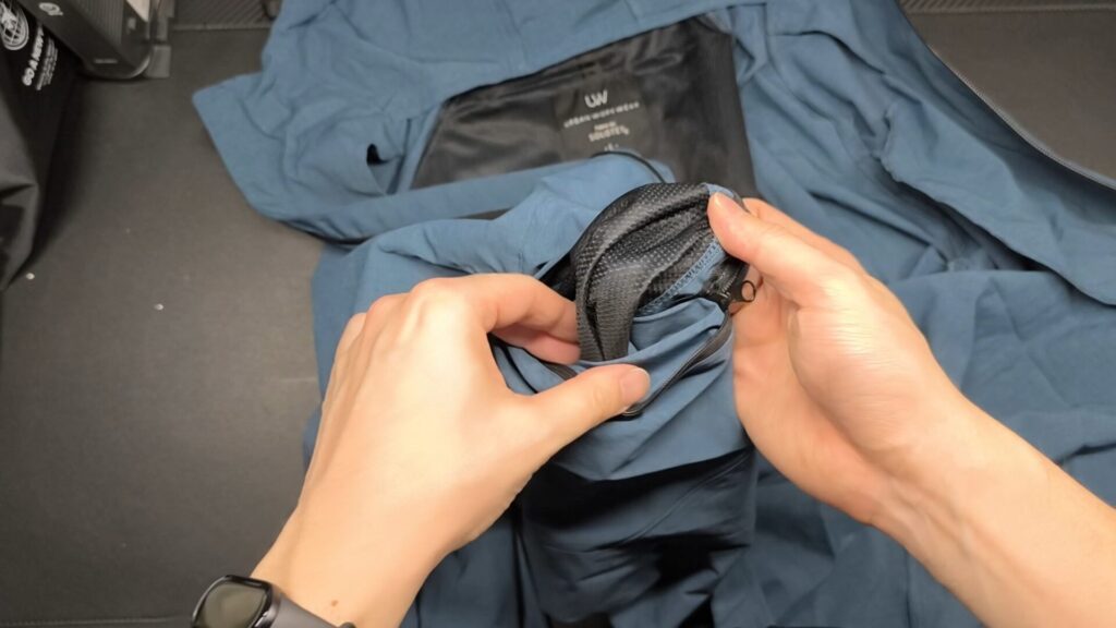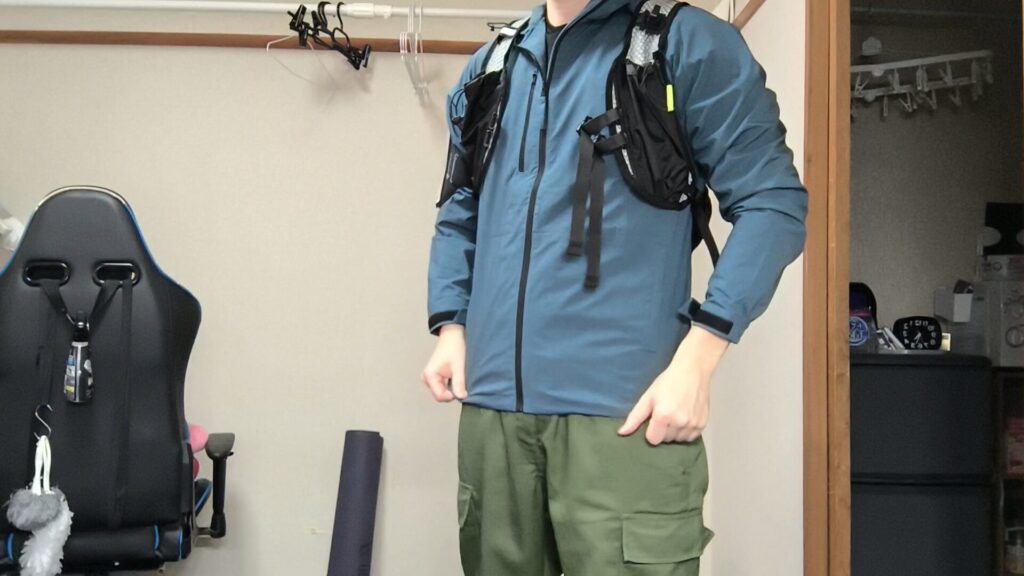 • 蒸れにくさの追求: 「防水(水を完全に通さない)」ではなく「撥水(水を弾くが空気は通す)」に特化し、さらに背中や脇ベンチレーション(通気口)を設けることで、衣服内の湿気を逃がし、非常に蒸れにくい構造になっている。
