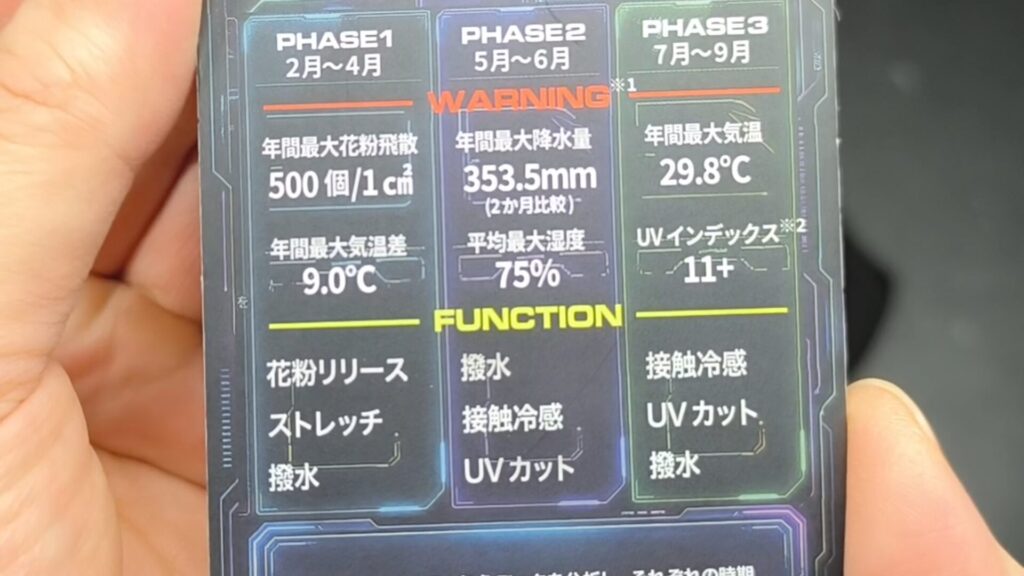 | 主な機能 | 撥水加工、UVカット、接触冷感、花粉リリース(落ちやすい)、耐摩耗 |