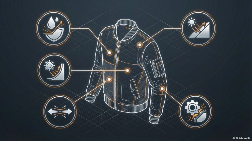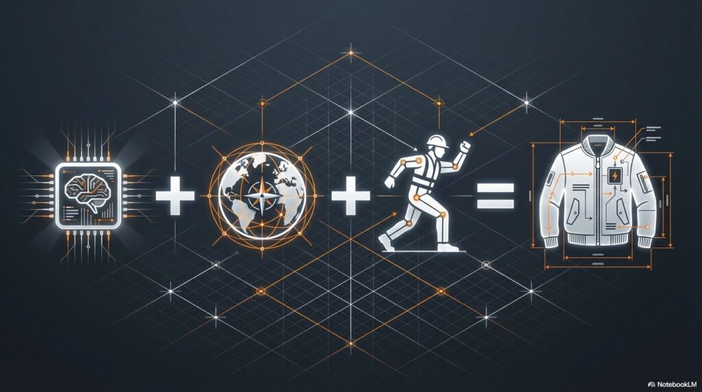 プロテクションウェザーは、「AIが導く最適解」をコンセプトに、素材選定からアイテム構成、人体に適したフォルムまで、AIシミュレーションによる緻密な計算を経て誕生した新基準のウエアである。