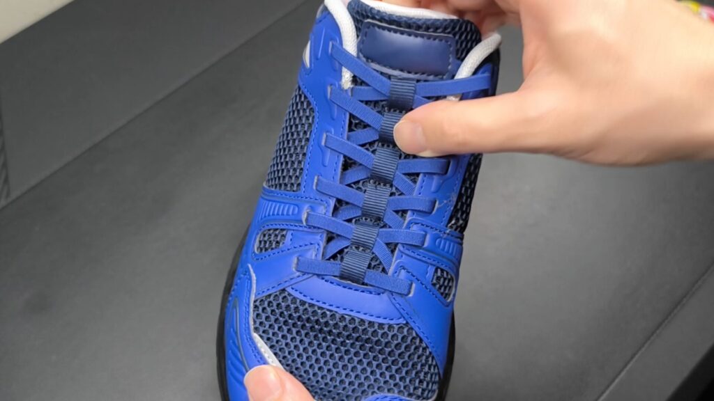 靴紐はゴム製で、シュータンに組み込まれているので結ぶ必要がないし、ほどける心配もない。